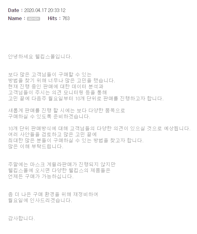 구매실패 후 위시리스트에 담아놓은 블랙 대형.. 오늘도 구매에 실패했는데 다음 주부터는 웰킵스의 판매방식이 변경된다고 공지가 떴어요 ㅠ_ㅠ 공식 공지내용부터 알려드릴게요.