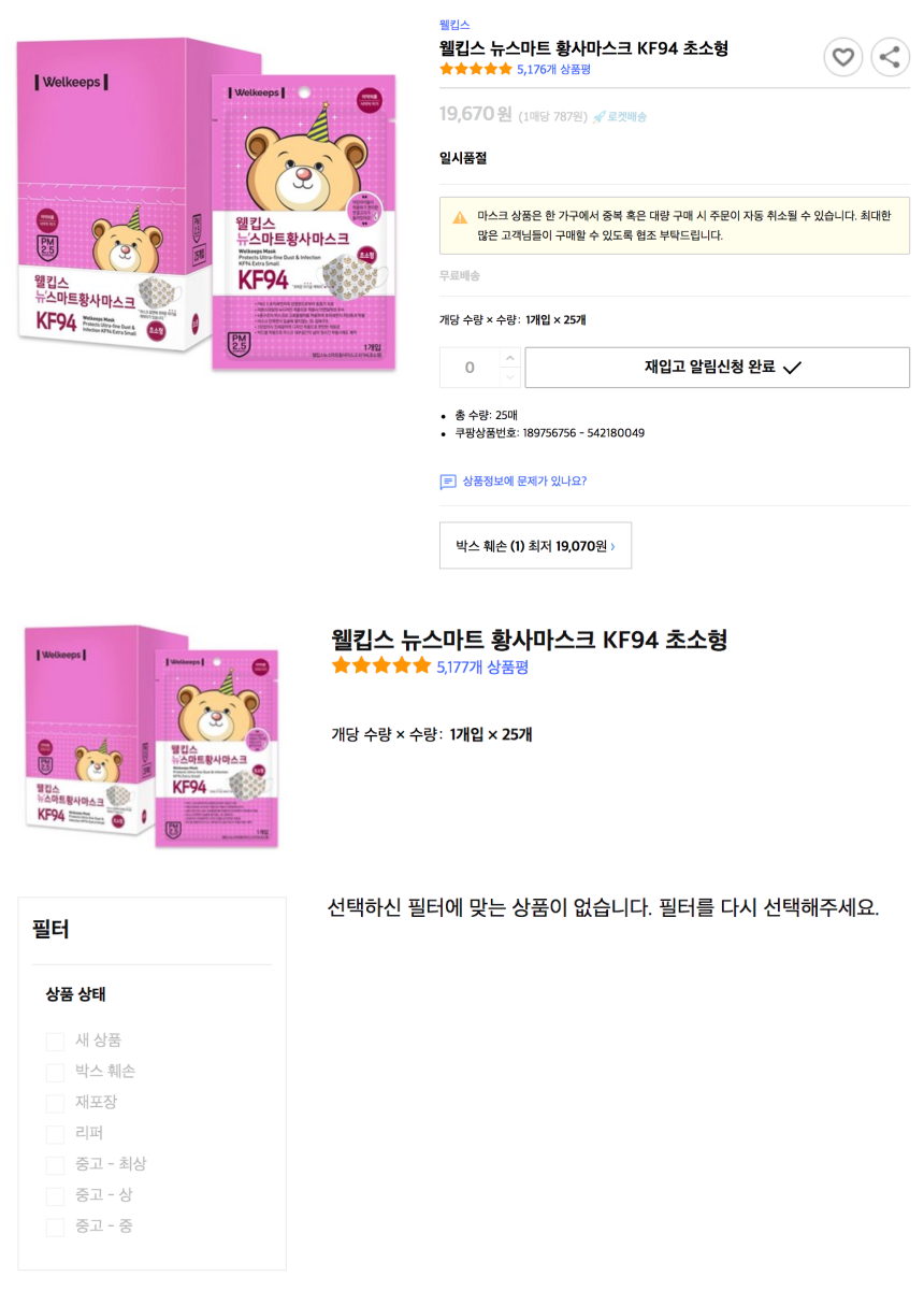 만약 저런 옵션이 보여서 상세페이지에 들어갔는데 안에는 옵션이 없다? 하면 누가 먼저 구매를 해간거랍니다 ㅠ_ㅠ 저도 박스훼손 상품을 알게된 후 이틀 정도 틈틈히 리스트를 확인하고 있는데, 어제는 더숨 황사마스크 블랙이 한 박스 떴어요. 누군가가 먼저 발빠르게 구매해가셨는지, 눌러보니 이미 옵션이 사라져서 구매는 못했지만 이게 정말 뜨는거라는 걸 확실히 알게되었답니다.