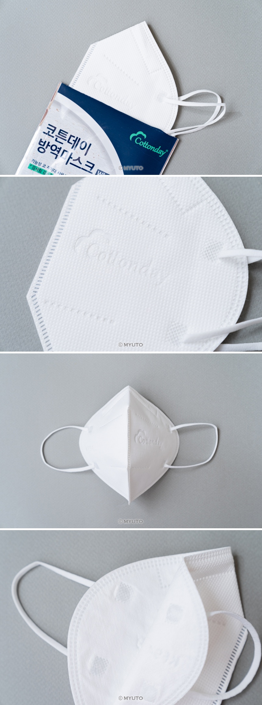 근데 신기한 건, 착용했을 때 느껴지는 사이즈감은 다르다는 거에요! 나인포는 썼을 때 턱부분이 손가락 하나 들어갈 정도로 남아서 착용감이 완벽히 좋지는 않았는데, 코튼데이 제품은 남는 공간없이 딱 맞아요. 어디하나 들뜨지도 않구요. 아마 펼쳐지는 각도나 어떤 부분에 있어서 차이가 나는가봐요. 중형~대형 사이 정도의 사이즈감이라 얼굴 큰 편인 성인 남자분한테는 좀 딱 맞겠다-싶기도했어요.