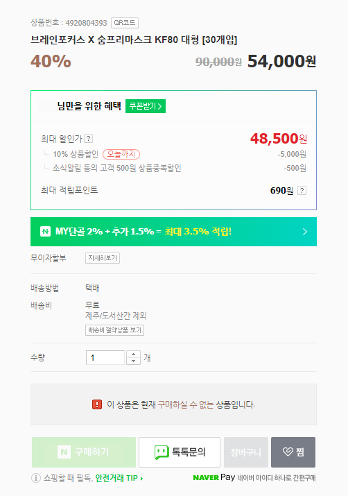 요즘 숨프리가 여러 업체들과 콜라보레이션을 많이 하는 것 같네요. 바우젠에 이어 사회적기업 브레인포커스에서 판매하는 숨프리 KF80 마스크입니다. 30매 54,000원 무료배송으로 올라와있으나 현재 네이버에서 주는 특가창고10% 쿠폰에 당첨되어 적용하면 아래 가격이 나옵니다. 1매 1616원 꼴이네요. KF80마스크만 찾는 분들도 계신 것으로 알고있는데 숨프리 마스크 품질 괜찮습니다. 제 블로그 후기도 참고해보세요 ^^