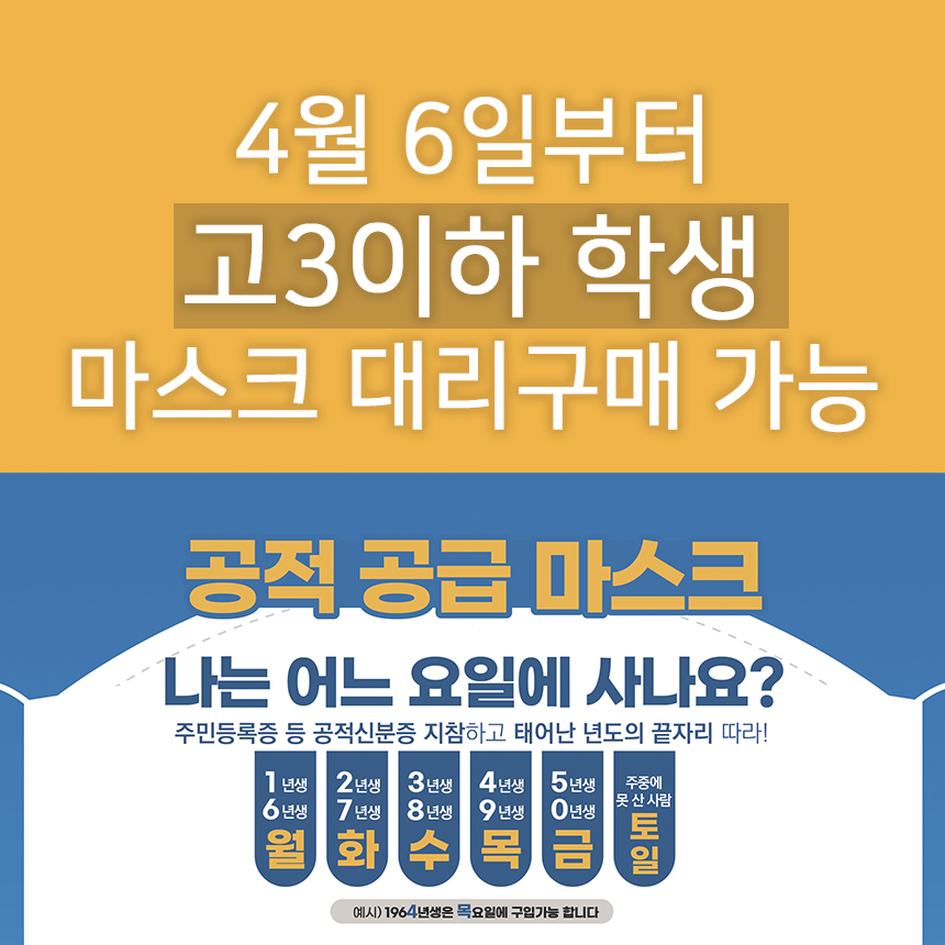 가족 마스크 구입에 힘드셨던 분들에게 반가운 소식입니다. 내일(4/6)일부터는 고등학교 3학년 이하(2002년 이후 출생자) 미성년자 전원에 대해 부모의 공적마스크 대리구매가 가능하다고합니다. 원래는 초등학교 4학년 이하(2010년 이후 출생자)에 대해서만 허용이 되었는데요, 이제부터는 고3까지도 허용이 되어, 자녀의 신분증과 주민등록등본을 가지고 자녀의 5부제 해당 요일에 약국을 방문하면 부모가 대리구매할 수 있다고합니다.